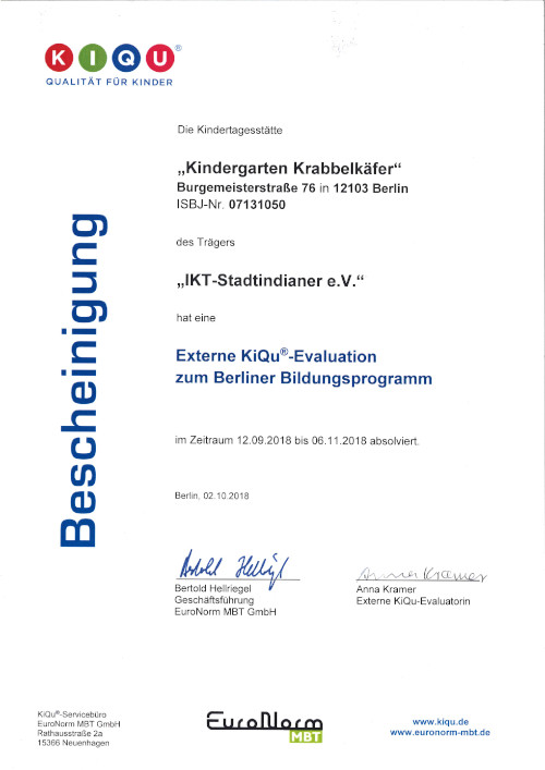 Wir sind eine Einrichtung des Vereins IKT-Stadtindianer und heißen bei uns 26 Kinder herzlich willkommen. Das Team der Krabbelkäfer besteht aus vier staatlich anerkannten Erzieher*innen. Zwei unser Mitarbeiter*innen haben eine Zusatzqualifikation als Facherzieher*innen für Integration. Das Team wird durch eine Praktikantin und einer FSJ-Kraft komplettiert.